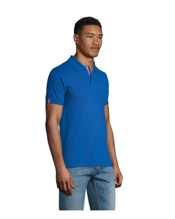 Футболка поло чоловіча SOL'S PATRIOT з коротким рукавом. Контрастна внутрішня сторона коміра. Посилена планка з двома білими перламутровими ґудзиками, контрастна смужка на планці і на внутрішній тасьмі по коміру. Декоративна двоколірна вставка на зовнішній стороні рукава і на бічних розрізах по низу вироба (зсередини). Виріб викроєн з трикотажного полотна. Приталений крій. Запасний ґудзик на внутрішньому боковому рядку вироба.